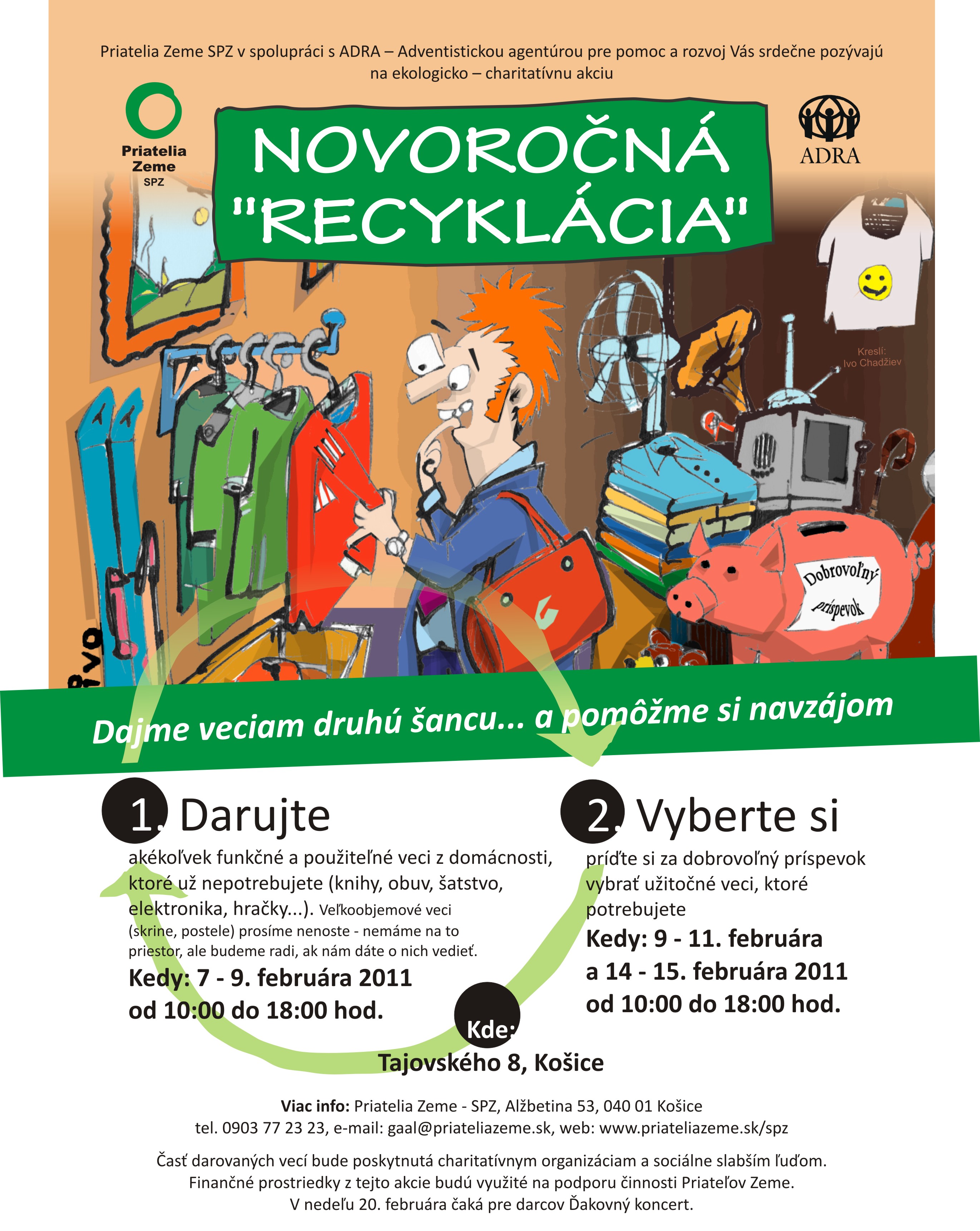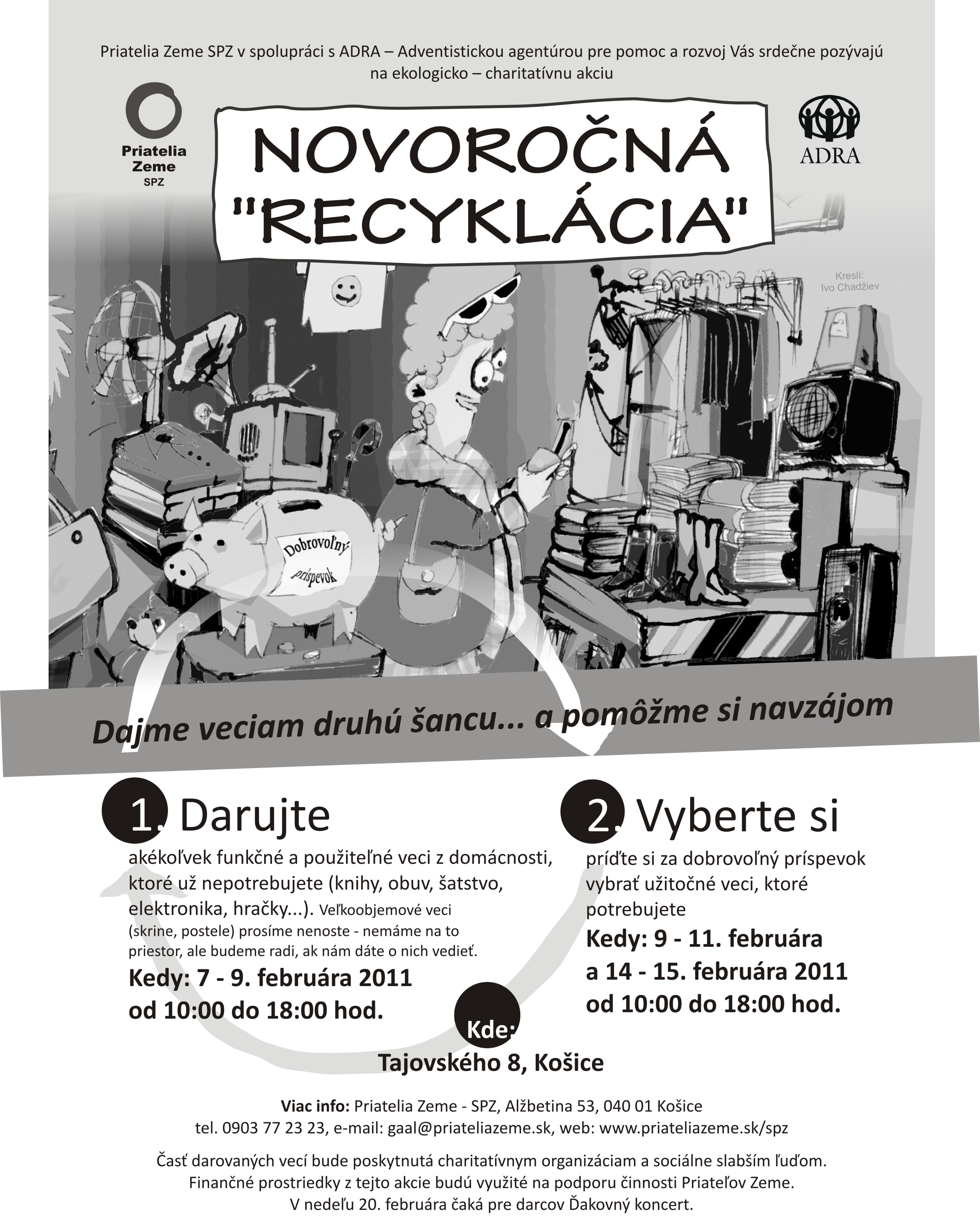 Priatelia Zeme - SPZ v spolupráci s ADRA vás pozývajú na ekologicko-charitatívnu super akciu "Novoročná recyklácia" (výmenná burza). Dajme veciam druhú šancu a pomôžme si navzájom.