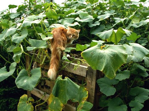 Kŕmime ho pestrou potravou zo záhrady, ako pokosená tráva, lístie zo stromov, výhonky z viniča na drobno posekané, zbytky očistenej zeleniny, ovocia a podobne. Kompostér je umiestnený v rohu záhradky, z jednej strany zamaskovaný menšími smrekmi a z ostatných strán sa ťahajú okrasné tekvice. Je to ideálne miesto na skrýšu pre nášho kocúra, odkiaľ vydrží pozorovať okolie celé hodiny. Na jar palety oddelím od seba, pričom ostane čistý kompost v tvare kocky, palety jednoducho zoskrutkujem na vedľajšom mieste a nový kompostér je pripravený na novú sezónu. O náš kompost je záujem aj práci, kde ho nosím kolegom na pestovanie chilli papričiek. A veru štípu poriadne.
