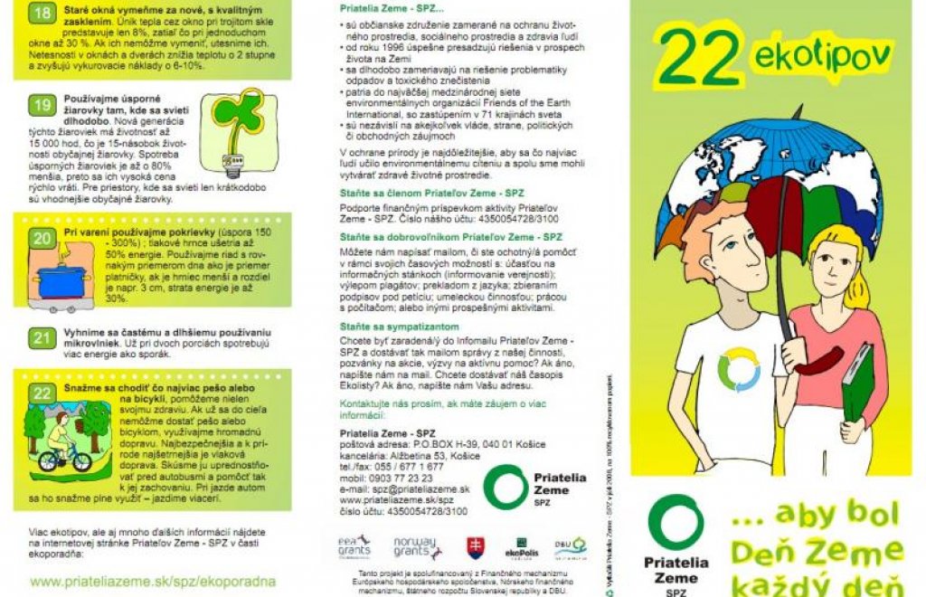 22 rád ako sa správať priateľsky k Zemi a prírode a ako ušetriť. Leták je určený pre mladšiu generáciu, čomu zodpovedá aj jeho ilustrované spracovanie.