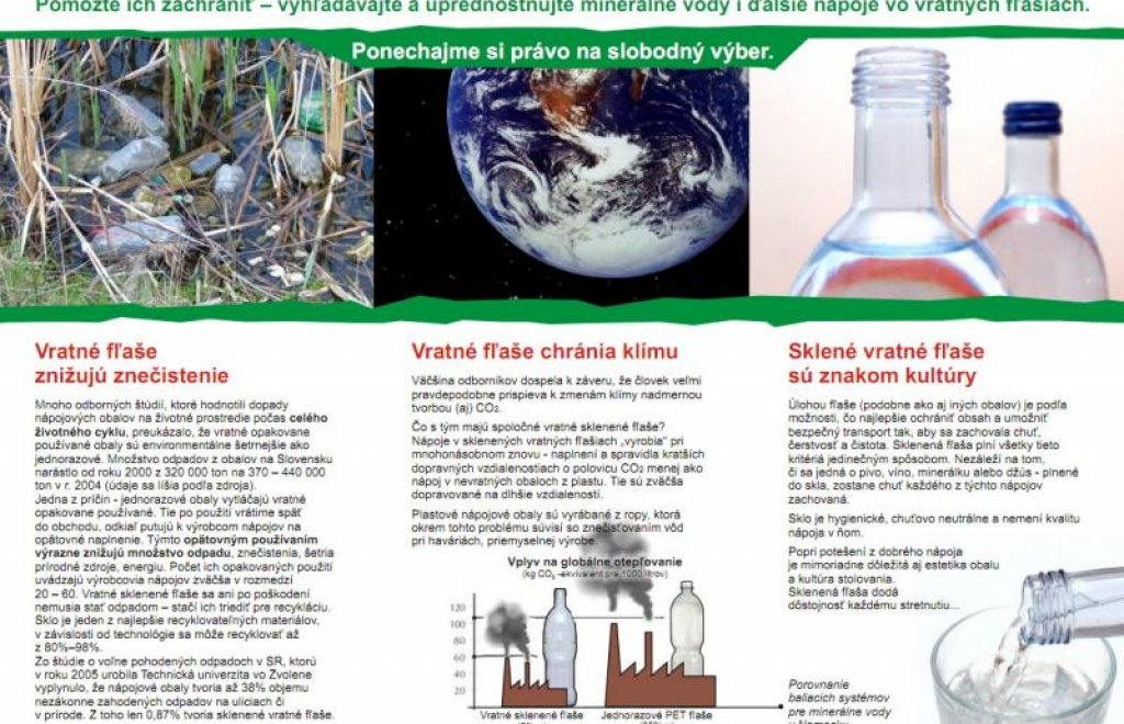 Leták A4 zložený na tretiny, plnofarebný na recyklovanom papieri, pôvodný rok rok vydania 2007, aktualizovaná verzia rok 2009 (nižšie na stiahnutie). Používanie sklenených vratných fliaš znižuje znečistenie, chráni klímu a šetrí peniaze. Sklenené fľaše sú taktiež znakom kultúry stolovania.