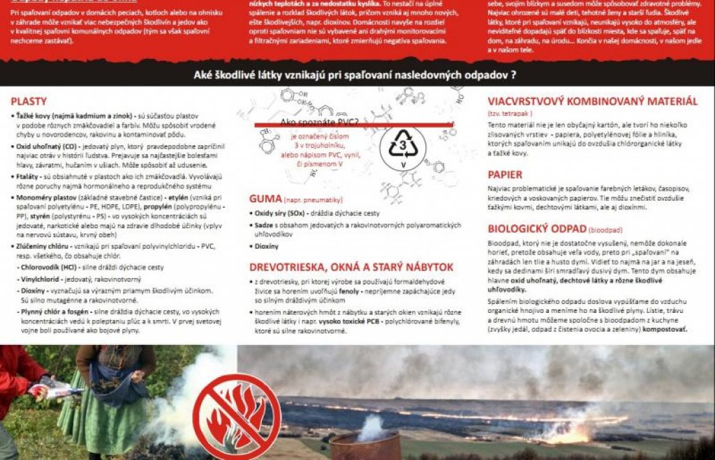 Obsahuje informácie o škodlivinách, ktoré vznikajú pri spaľovaní rôznych druhov odpadu v domácnosti: plasty, guma, drevotrieska, papier atď. Tiež popisuje negatívne účinky týchto škodlivín na naše zdravie.