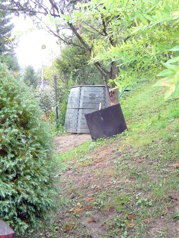 Ich výška je 100 cm a priemer 90 až 100 cm. Zásobníky sú celý čas prikryté plechom. Druhý spôsob kratšie, len cca 3 mesiace. Je určený na ostatný biologický odpad. Využívam k nemu plastový kompostér, ktorý sme dostali od obce. Má objem 1050 litrov a je to kráľ medzi kompostérmi.