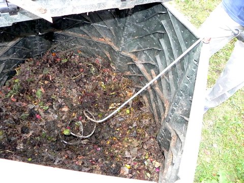 Ku kompostovaniu som si vyrobil viacero pomôcok. Pri kompostovaní je totiž veľmi dôležité zmenšovanie a miešanie odpadu. Dva druhy sekáčov používam na zmenšovanie všetkých mäkkých odpadov. Jeden je naostrený plocháč privarený na rúčke. Napr. opadané jabĺčka hodím do vedra a sekáčom ich za niekoľko sekúnd nasekám na drobné kúsky. Ďalším sekáčom, ktorý je do tvaru šípky, sekám väčšie časti priamo v kompostoviskách. Na drvenie konárov používam kúpený pomalobežný drvič. Prekopávač som si vyrobil z drôtu na hromozvod a používam ho na miešanie a prevzdušňovanie materiálu v kompostoviskách. Na prekopávanie používam aj vidly.