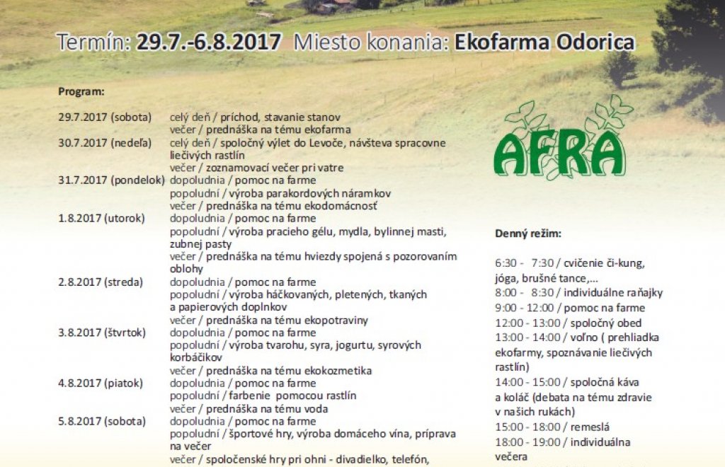 Záujemcom o podobný typ tábora môžeme odporučiť Eko tábor, ktorý organizuje v dňoch 29.6. až 6.8.2017 majiteľka Ekofarmy Odorica Zuzana. Na Odorici sa posledné roky konal aj náš tábor. Viac informácií na www.odorica.sk.