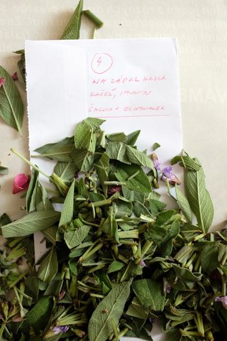 • Šalvia lekárska: má protizápalové, antibakteriálne účinky a antivirózne účinky. Vynikajúca je nie len na pitie, ale aj na kloktanie pri bolesti hrdla. Pomáha pri bolesti brucha, nafukovaní a hnačke.[2]